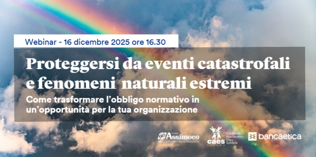 In vista del 31/12/2025, data entro la quale anche gli iscritti al Registro delle Imprese come piccole/micro imprese si dovranno adeguare all'obbligo assicurativo contro le catastrofi naturali, l'evento - pensato insieme a Gruppo Assimoco ed a Banca Etica - ha l'obiettivo di chiarire cosa prevede la normativa sulle polizze catastrofali, chi è obbligato a stipularle e quali sono le tipologie di eventi coperti ed i limiti di risarcimento.